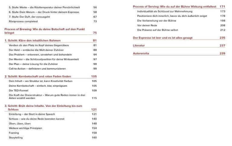 Dieses gut lesbare Buch motiviert im Hinblick auf das Halten einer Rede. Es liefert praxisnahes Handwerkszeug und stellt inspirierende Fragen auch und besonders im Hinblick auf die eigene Persönlichkeit des Redners. Nach einer gewissen Zeit fand ich die Analogie des Rede-Prozesses mit dem Brauen eines Espressos (daher der Name des Buchs) zwar leicht nervig, insgesamt aber kann ich dem Buch hohen Nutzwert und gute Lesbarkeit bescheinigen. Wenn Sie eine Rede halten möchten (müssen?), dann empfehle ich Ihnen dieses Buch.
